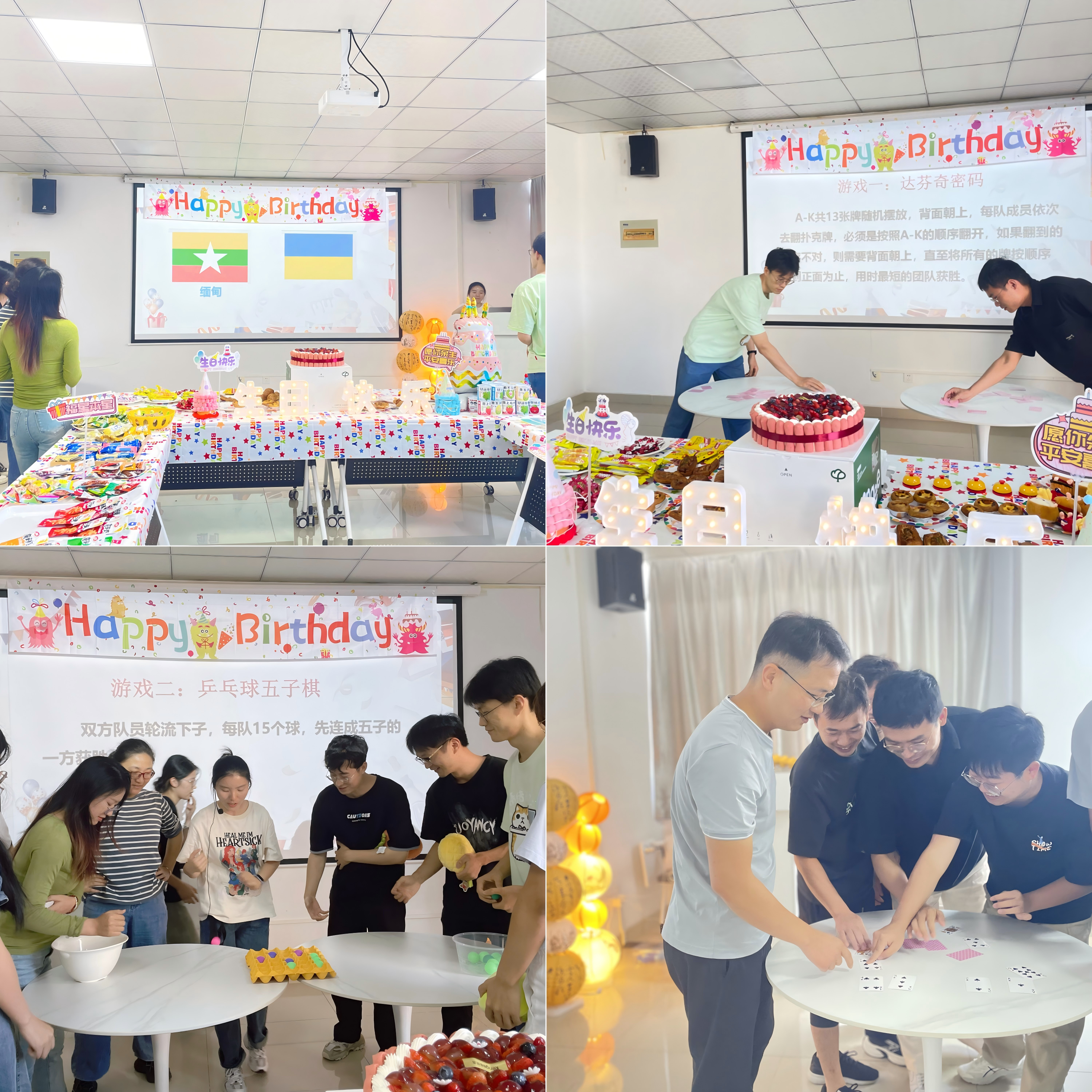 生日有礼,有趣有盼。达芬奇密码、国旗猜猜猜、占地为王、乒乓球五子棋等暖场小游戏一开始,就点燃了全场的热情。集思广益,配合破解谜题;互博对弈,各自大显身手,小寿星们在轻松的气氛中感受到了团队的凝聚力,现场欢声笑语不绝。