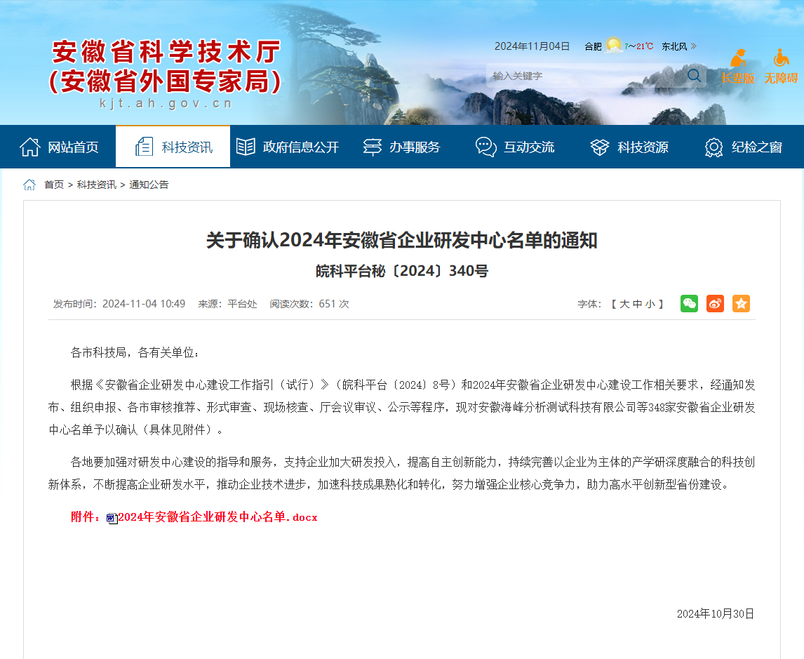 近日,安徽省科学技术厅宣布《关于确认2024年安徽省企业研发中心名单的通知》,诚博国际荣获“安徽省企业研发中心”认定。