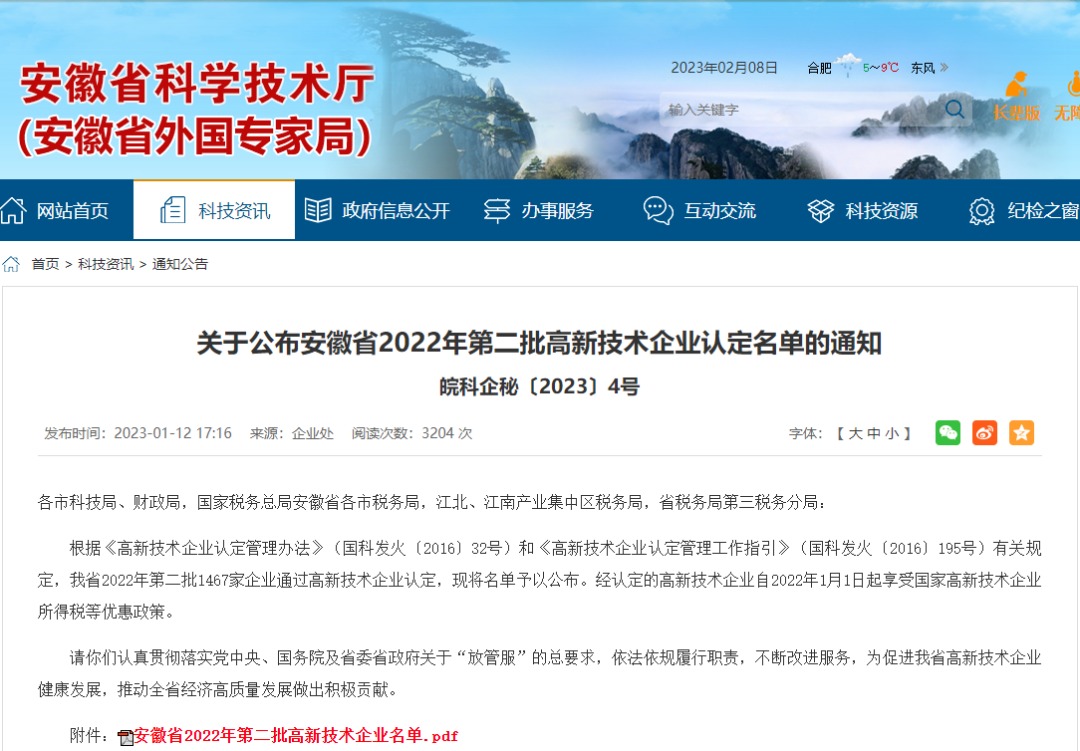近日,安徽省科学技术厅线上公示了安徽省2022年第二批高新技术企业认命名单,诚博国际精密正式迈入国家高新技术企业行列!